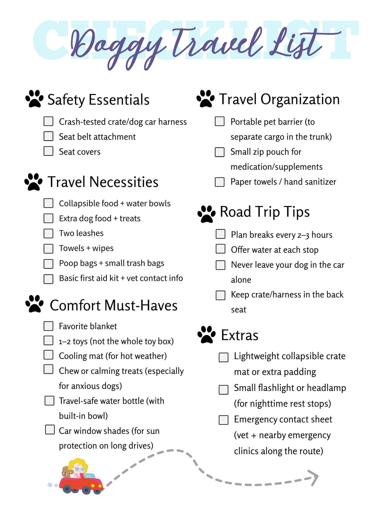 - Crash-tested crate or dog car safety harness (don’t compromise here)
